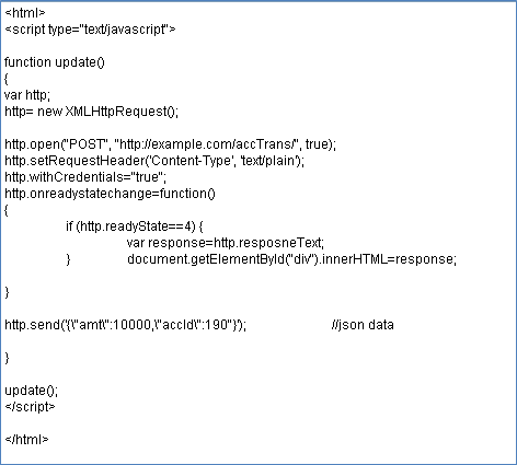 The attacker, who also happens to be a valid user, creates a script and tricks the authenticated user to click on a link which fetches the following html page and loads in his browser.