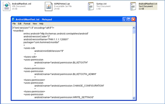 The same extracted folder contains one xml file called AndroidManifest.xml. It contains all the properties settings of the application installed such as, permissions to access other apps, other apps' permissions to access this app, intents, etc… The problem here is this xml file couldn't be read easily as normal xml files because this is in binary format. We need a special tool to convert it to a human friendly format. For that purpose, we will use a tool called AXMLPrinter2.jar (http://code.google.com/p/android4me/downloads/detail?name=AXMLPrinter2.jar& ).