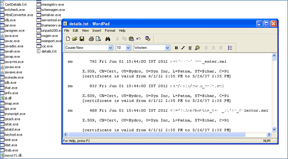 We may also see the details about the certificate used to sign such as issuer, validity, algorithms, etc [Figure-15]... Enter the following command against the certificate. The certificate is placed under the 'Meta-INF' file: