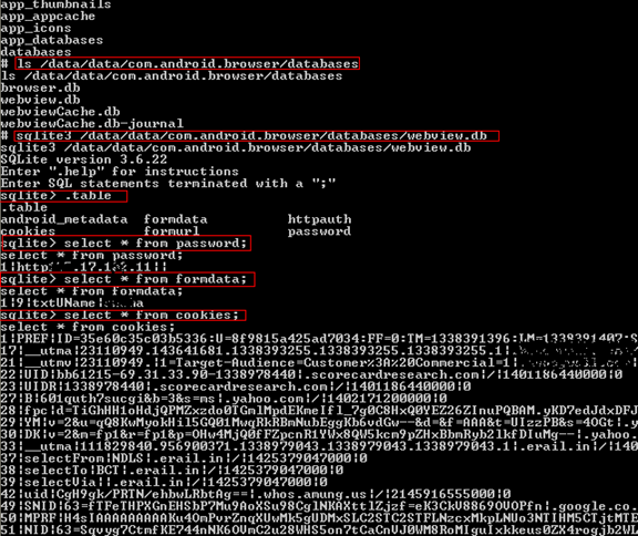 We can use another command in SQLite3 to query databases used by apps to store tables and data. We can verify to see if any sensitive information such as passwords, credit card numbers, and so on are stored in clear text.