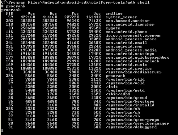 The next command is procrank. It shows the running processes and their respective PIDs [Fig-21]: