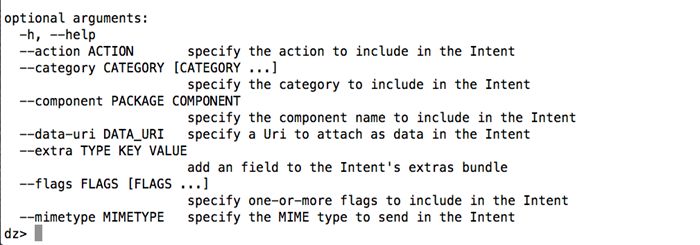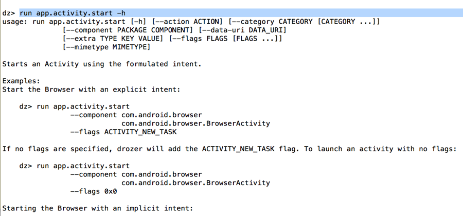 run app.activity.start --component com.mwr.example.intenttest com.mwr.example.intenttest.IntentActivity --flags ACTIVITY_NEW_TASK --extra string URL "Some Text"