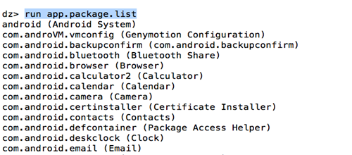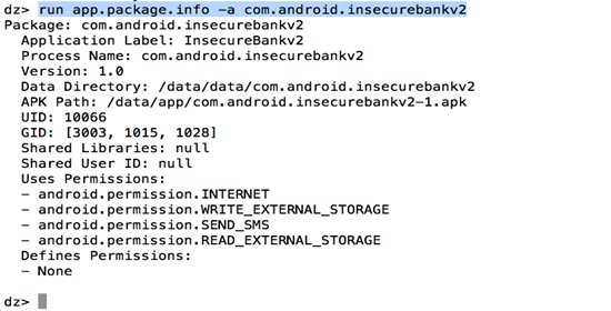 Now, to find info about a particular packages, use the module app.package.info. It will give out a lot of info about the application, for e.g the path where the application files are stored, the permissions that the application uses etc.