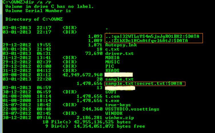 The use of the TAB key and the SHIFT+TAB modifiers enable you to complete fast searches like feature. To cycle around the directory names and files in a given path and to forward the searches press TAB and to go in reverse type SHIFT+TAB. This fills up the path of the file or folder present in the display and saves the user the detailed typing for long names. The dir command is very useful indeed with its various modes to filter out the names and filesystem characteristics. C:>dir /a/b This gives a basic listing of all directory and file attributes with even hidden and system files read into view. 'Dir /a' gives the detailed listing of every folder and files more than the default dir. The attribute switch takes H as a parameter to filter and display only hidden files. The D switch is used to filter only directory names. Use the /P switch to pause the screen so that it can be a handful and not a mouthful to deal with. To display only hidden directories in given path, type C:>Dir /aHD /b Apparently case sensitivity works for commands, though regarding path names and commands themselves they are case insensitive. Use – (minus) to negate a specific property. C:dir /a-H-D /b , would display only the non hidden files in bare format. The need for recursive searches might be useful and the /S switch gets it just right and parses all the underlying subdirectories in the parent folder. The options for file attributes like S for system files, A for archived files and R for read-only files get more specific for the /a switch. Further the use of application specific data format files or user data for an application can be stored using reparse point(s). These points are leveraged by Windows to find hardlinks for external media contained files and filesystem filters for the type of data format in question. There are certain conditions Windows requires to utilise reparse points. Look at the following, for example: http://msdn.microsoft.com/en-us/library/windows/desktop/aa365503(v=vs.85).aspx The /T switch displays the timestamps for Creation, Last Access and Last Written. Another forensics related important data that can be revealed without any special 3rd party tool is the infamous alternate data stream for the NTFS filesystem. The /R switch displays any alternate stream in the final output.
