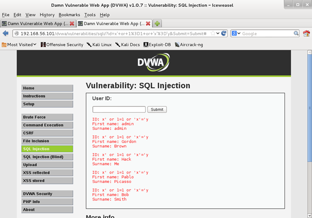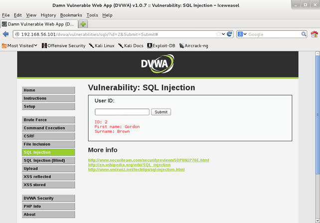 Let's attack the website in DVWA that is vulnerable to SQL injection. The user is asked to enter User ID. Then the first name and surname of the user are displayed.