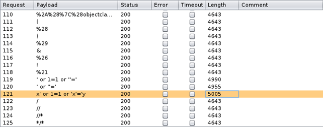 Let's see how the website responds to different payloads. As we can observe, the length of the response changes. It is 4699 bytes for baseline request (the one with id equal to 2) and 5005 bytes, when x' or 1=1 or 'x'='y is the payload.