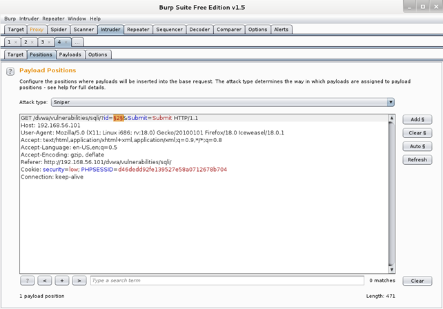 Let's set the security level to low (it can be changed using DVWA Security) in DVWA. Then enter User ID, click submit and intercept the request with Burp Suite Proxy. The next step is sending the request to Burp Suite Intruder (click right on the request and choose "Send to Intruder"). Then use the "Add" button in Burp Suite Intruder to choose the parameter that will be fuzzed (it is called payload position in Burp Suite Intruder). User ID is sent in parameter id. That's why it is chosen as a payload position.