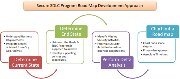 We'll systematically follow an approach that will help us build the road map for our S-SDLC program.The following is a pictorial representation of our approach: