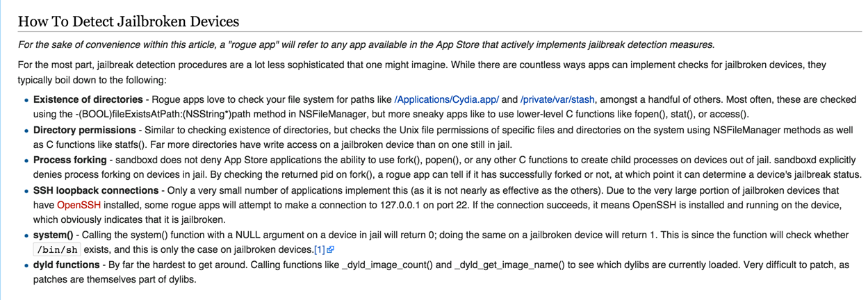 A very handful resource for detecting jailbroken devices can be found here. Here is a screenshot from the page. The purpose of Xcon is to make sure all these checks fail.