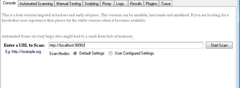Now, you can select from the different scan modes in the tool to perform the scan. The two scan modes are default and user-configured settings. It is said that the IronWASP tool has an effective crawler so that you can find more bugs.