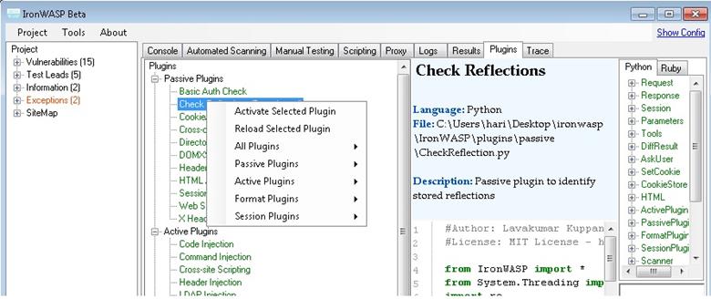 Another feature of this tool is that it has a scripting shell for both Python and Ruby giving full access to the IronWASP framework, and this can be used by the pen testers to write their own fuzzers, create custom crafted request, analysis of logs, etc.
