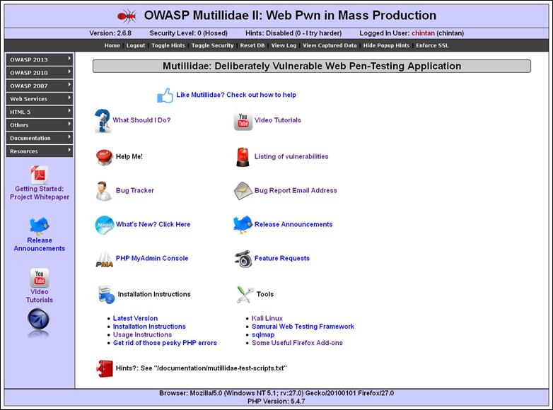 NOWASP Mutiliadae is a purposely vulnerable web application containing more than 40 vulnerabilities. It includes all of the OWASP top 10 vulnerabilities along with vulnerabilities from other organizations' lists. There are other small and mid-level range vulnerabilities that are scanned by different web application scanners, such as Vega, Acunetix, Nikto, w3af, etc. I am going to use the latest version of this project, which has an object-oriented design to provide better understanding of all vulnerabilities of the web application.