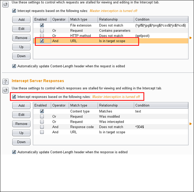The reason I am using these settings is because our target host might link to a ton of other websites via share buttons, advertisements, etc. I want to intercept all the communication between myself and my target host, but not any other website. That is why I tick that checkbox to intercept only a request that "Is in target scope." I also want to intercept each response that is processed by the server against my all responses so that I can know if my request is processed properly or have I been redirected to somewhere else, etc. So I tick that option that shows "Intercept all the responses."