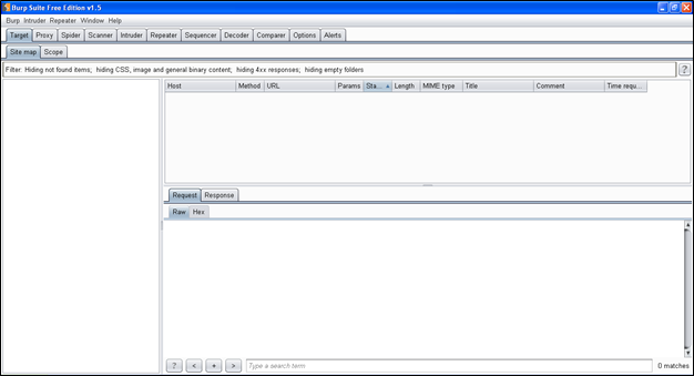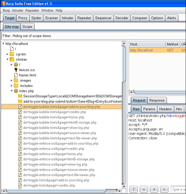 Another tool that I am going to use is Burp Proxy. This is an interception proxy tool that interacts between the client (a browser application, e.g., Firefox or Chrome) and the website or server. It will be running on my local machine and it will intercept inbound and outbound traffic between the browser and the target host (in our case, the target host is NOWASP Mutiliadae). The major use of this tool is when you make a request to access the server, Burp Suite intercepts that request from your machine to the server/website and you can change the request according to your needs. Also it reveals the type of the request, whether it is a GET or POST request or some other. Burp also has the ability to show you the list of parameters that are used by the website in order to pass your request to from you to the server. You can manipulate the request to change the way you want to check the security of that particular web application. To intercept the request, your Burp Proxy listener must be configured on a 127.0.0.1 localhost and port 8080. Then you also set this proxy configuration in your web browser. After doing so, go to Burp Suite => proxy tab => Intercept is on (make sure this button is pressed). I will not go deep into all the tabs and their functionality. You can see the Burp manual or documentation for that.