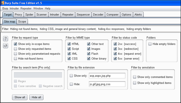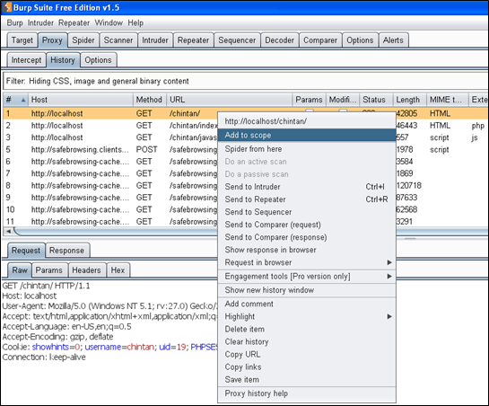 There are plenty of ways to gather information. However, people mostly follow Google, Recon-ng Framework, and other application security testing tools. I will list all the pages and folders of my target using the spider option in Burp Suite. To do that, go to history and check the first page you visited. Right click on that and select the option to add to the scope.