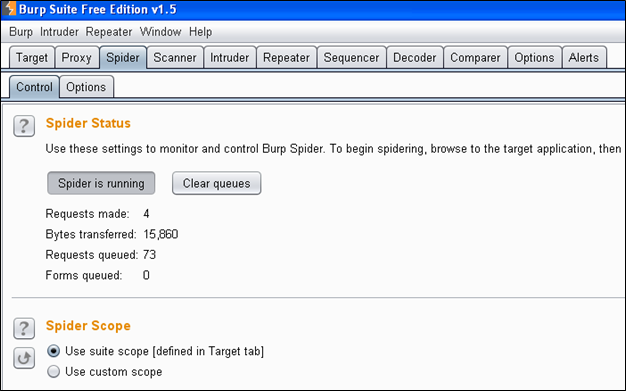 After clicking on that, the spidering of your target host will be started. If you go to the spider tab, you will see something like the picture below.