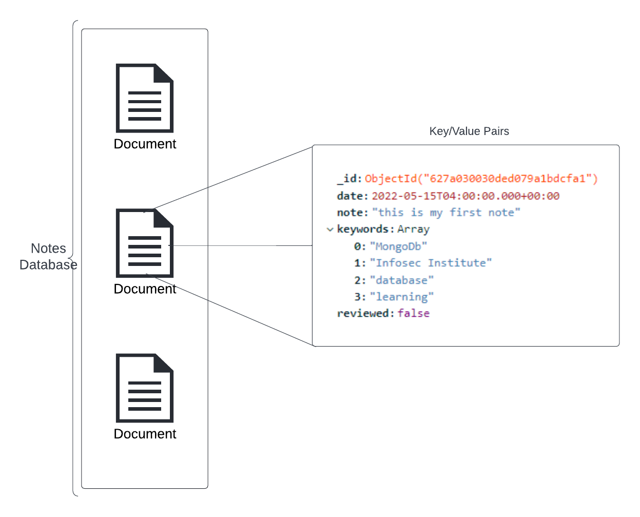 In the example above, we can see that a database called “Notes” contains multiple documents. The second document contains data stored in the form of field-value pairs. Notice that the data stored in this document contain different data types. You can see that the date field holds a value for a date datatype, the note field holds a string value, the keywords field holds an array of strings and so on. Many other data types are supported and can be found in the official documentation at MongoDB.