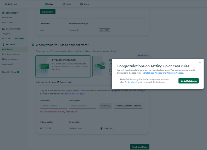 You will be prompted to choose a serverless, dedicated or shared database instance. Choose the “Shared” or “Free Tier” instance, which is free. The shared instance comes with sample datasets you can use for your own applications. You can also define custom datasets. Finally, create a username and password with read and write permissions, then scroll down and click “Finish and Close.”
