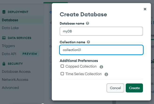To create a new database, navigate to Deployment > Database and in your new cluster, click ”Browse Collections.” Next, click “Create Database” and enter a database name and a collection name.