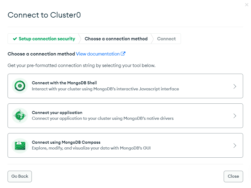 First, we will need to download and install the MongoDB shell. We will use the shell to manage data in the cluster. Navigate to the cluster and click the “Connect” button. For the connection method, choose “Connect with the MongoDB Shell.”