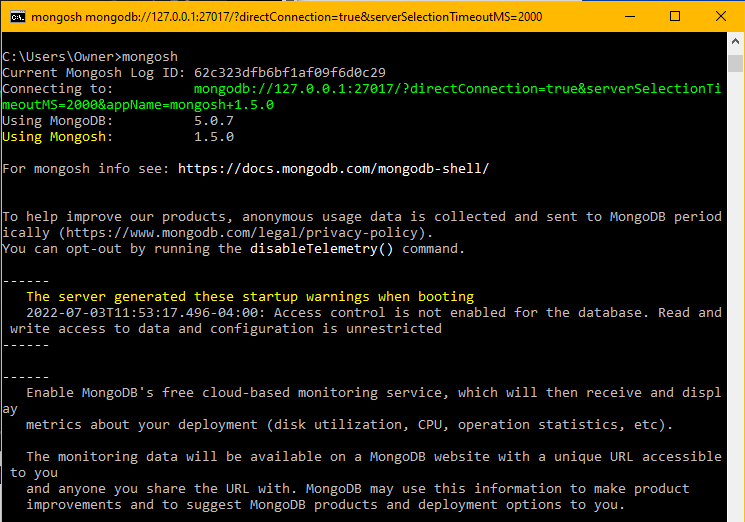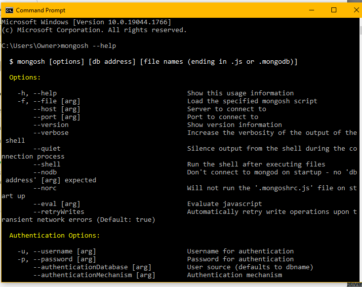 Follow the instructions and download and install the shell. When you run mongosh (Mongo Shell), you will be prompted for a connection string. Run your connection string in your command line when prompted. Once you have successfully installed mongosh, you can open a terminal and start using the shell. To get a list of commands and syntax use ‘mongosh --help.’