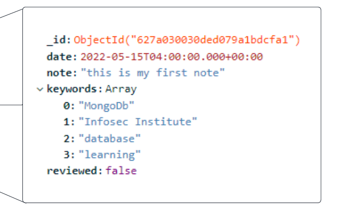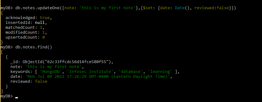 In the example below, we use the db.collection.updateOne() function to update the document we just created. We will add a date field, an array of keywords and a boolean that indicates whether or not the note was reviewed. In the example below, we use the updateOne() method to find the document by the note value and add an array of keywords: