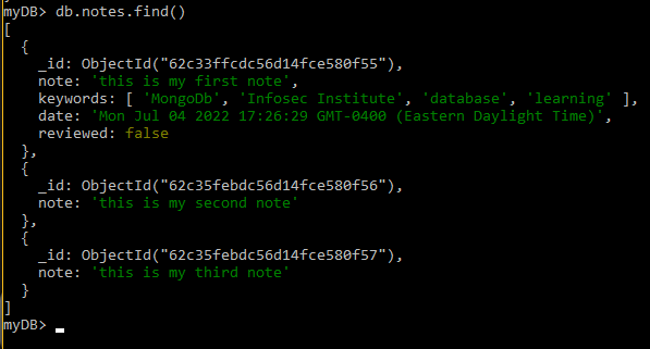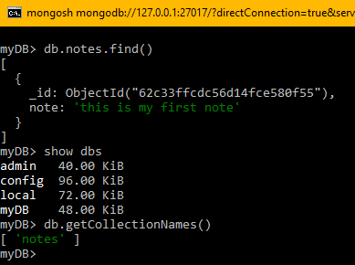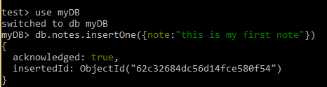 To add the data points, we first switch to the myDB database using ‘use myDB.’ MongoDB will create the database if you do not already have it. Then we can start using queries to create and manage collections of documents. In the example below, using the insertOne() method, we create a new document to hold the note “this is my first note” in a newly defined collection called notes. For example, we use to create a new note:db.notes.insertOne({note:’this is my first note’})