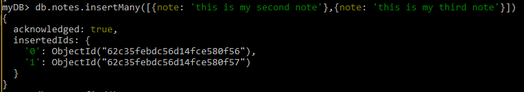 As you can see, the response shows the database accepted the request and automatically generated a unique id value for the document. Let’s add a couple more notes using the insertMany() function. This function allows us to insert multiple documents at once.