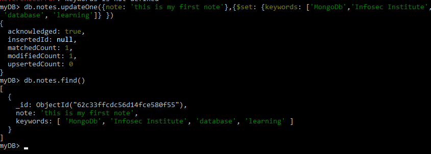 db.notes.updateOne({note: 'this is my first note'},{$set: {keywords: ['MongoDb','Infosec Institute', 'database', 'learning']} })