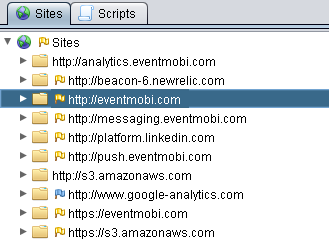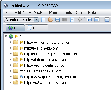 One of the many things ZAP does well is organize detected assets by site of origin. This makes it easy to see where a target site stores its assets and runs its application. In the case of our target site we can see resources come from newrelic.com, linkedin.com, amazonaws.com and google-analytics.com, among other places.