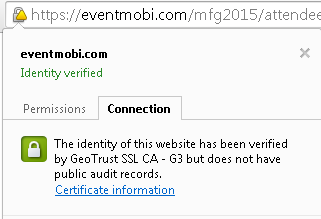 To research this further and see if https is an option if we want secure transport, we can go back to the browser and simply change the main URL from http://eventmobi.com/mfg2015/attendees/76204 to https://eventmobi.com/mfg2015/attendees/76204. In this case, the site doesn't load (there is an eternally spinning "loading" circle), so we switch to a "normal" browser (not going through the proxy) to confirm the lack of HTTP support. Since the behavior is the same with our proxied and normal browsers, we reach an unfortunate conclusion: this site doesn't use HTTPS by default, and won't support HTTPS if we ask for it.