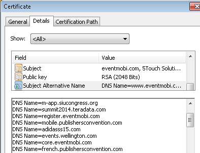 Finally, take a look through the other fields on the certificate. In this case, there is an interesting list of what appears to be customer-specific sites in the "Subject Alternative Field." If you plan on using your own domain name through the provider, having this list broadcast to anyone who connected to the provider's Web site might or might not make you nervous.
