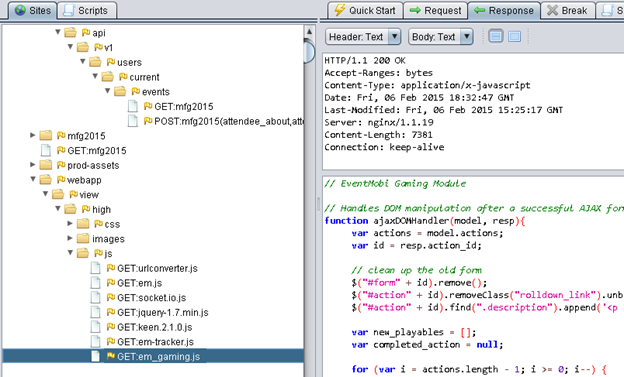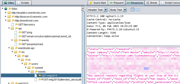 Once you have a nice set of data, return to the ZAP console and open the tree that corresponds to our target site (in this case, "http://evenmobi.com"). Then drill down into a particular request and click the "Response" tab to see what the target site is telling us.