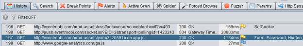 Another place to look for potential exposure is the history of requests at the bottom of the ZAP console. In this case, ZAP has highlighted a "*.js" file that contains the word "password" and warrants further inspection.