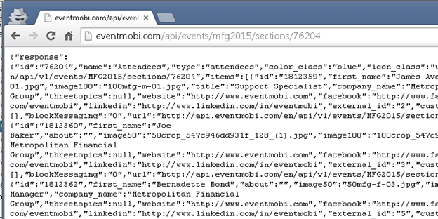 This is a block of JSON that shows that the target site will happily dump a complete attendee list, including self-provided contact information.
