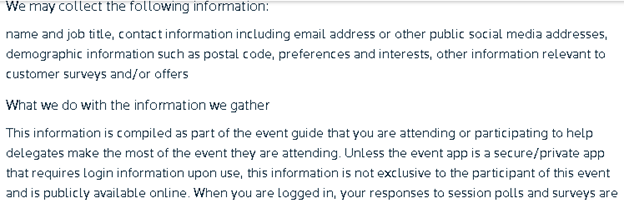 In a section about the type of information collected and its use, our target accurately lists what they collect and states that the information of participants is "publicly available online" (as we saw while looking at Web service access controls).