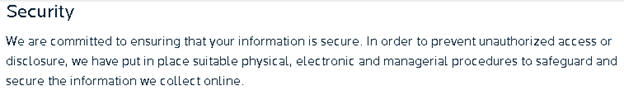In the "Security" section we see a statement about "suitable procedures" to protect information collected online. This is vague enough to encompass what we saw in our investigation (e.g., no encryption for public information), but without more inspection we have to take our target on its word.