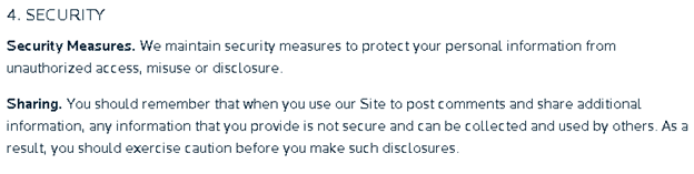 Finally, another "Security" section contains a vague promise of "security measures," and then honestly puts the onus of not posting anything confidential on the users.