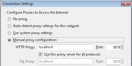 - Open your selected Web browser and set up its proxy settings, located here in current versions of Firefox ("Options" dialog, "Network" tab, "Connection" section, "Settings" button):