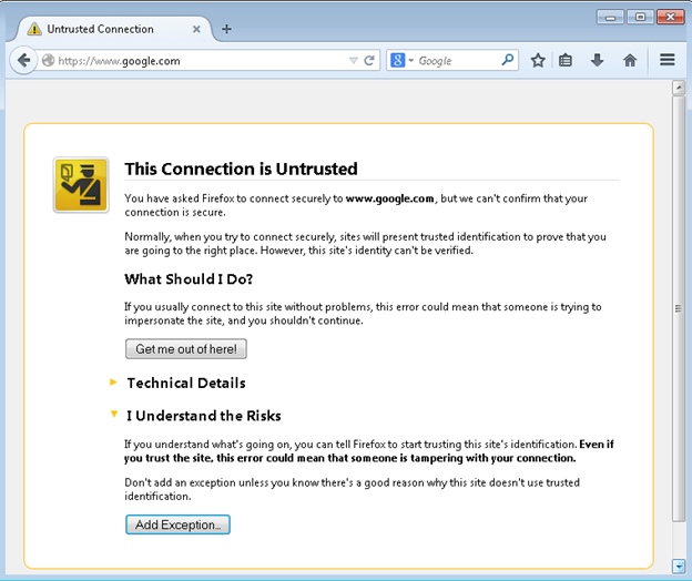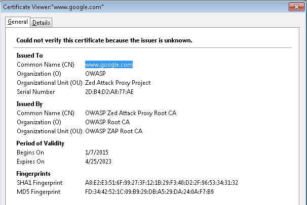 - To test all this, restart your selected browser, make sure OWASP ZAP is running, and contact an HTTPS-protected site like https://www.google.com. You may immediately see a certificate warning page like this: