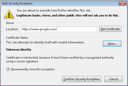 Click the "Permanently store this exception" box and then click the "Confirm Security Exception" button (or similar controls) to dismiss the error and proceed with your connections.