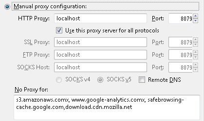 As you perform research on various sites, you may also want to set up a list of sites that will not be queried through the proxy. These settings are usually near your browser's other proxy settings. For example, in Firefox, they are immediately below the proxy host and port settings.