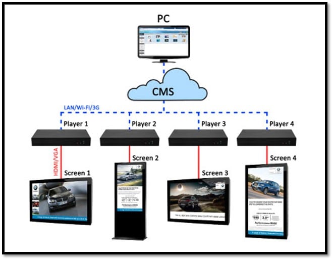 Content Management Software: Content management system (CMS) software manages the content that will be transferred to multiple media players spread across a geographical location. This software allows you to schedule the content and playback settings like screen layout, borders, the duration for which the media must be played, etc. This act as a centralized solution from where all the DMPs can be controlled. This includes sending the new media files, playing instructions, the status of DMP (Live or Not), Patch management in some cases. The CMS software can be a browser-based web application or desktop based thick client application.