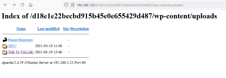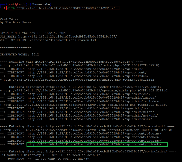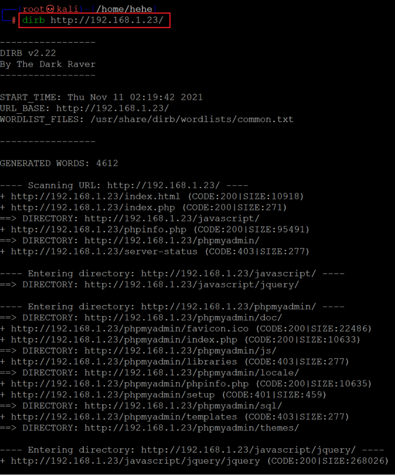 Command used: << dirb http://192.168.1.23/d18e1e22becbd915b45e0e655429d487/ >>