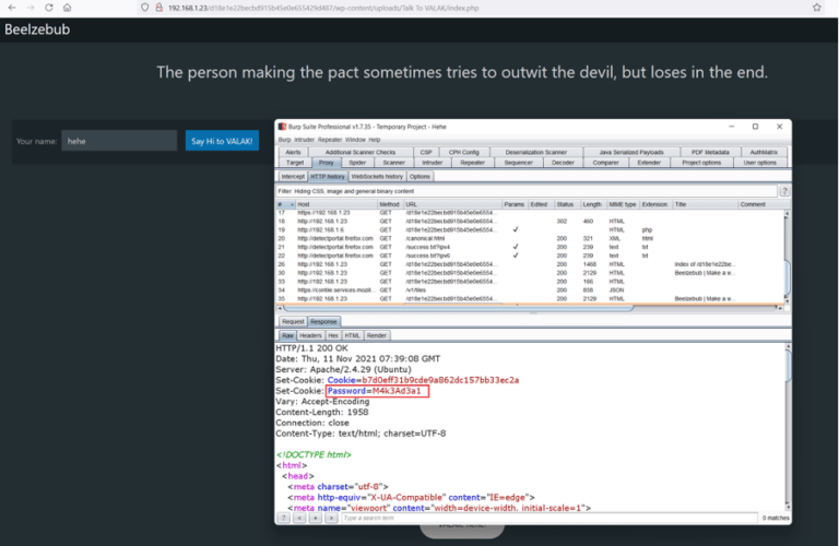 We found another folder named 'talk to valak' in the' uploads' directory. We found some applications running through this folder when we clicked on the folder. We configured the burp suite to analyze the application for weaknesses. While going through the requests in the burp suite, we found something exciting in the cookie section, which can be seen highlighted in the following screenshot.