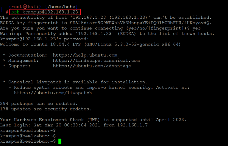 The identified username is Krampus. We know the password as identified in the previous step. We already know that SSH default port is also available on the target machine. So, we will log in to the SSH in the next step.