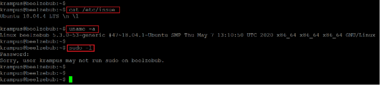 The operating system and kernel version can be seen in the above screenshot. We researched over Google for an available and working exploit, but none could be useful. We used the 'sudo –l' command to check the sudo permissions for the current user 'krampus'. We found that the current user does not have permission to run the sudo command.