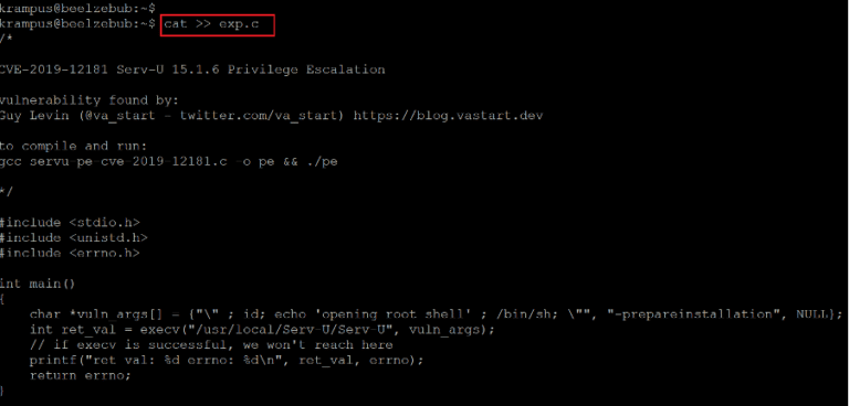 We used the cat command to create the exploit file named 'exp.c' and copied the exploit code as given on the website. To execute it on the target machine, we need to compile it first. We will use the gcc compiler for this purpose. The command uses, and the results can be seen below.