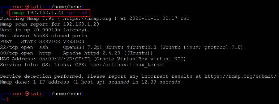 Command used: << nmap 192.168.1.23 -p- -sV >>