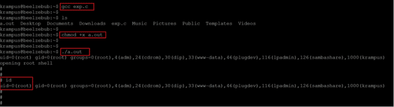 After compiling the file using gcc compiler, it created an executable file named 'a.out' which can be used to exploit the local privilege escalation vulnerability by simply running the executable file on the target machine. We used the chmod utility to give executable permission to the file 'a.out'. After that, we ran the file on the target machine using './a.out' command. Upon successful execution, it provided root access on the target machine, and the same was verified using the 'id' command.